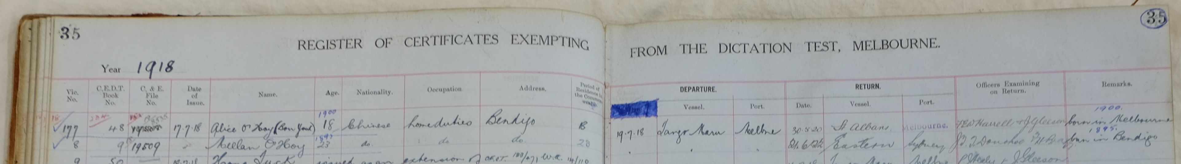 The Chinese Australian Family Historians of Victoria (CAFHOV) have led a project to create a searchable database of the National Archives of Australia’s Victorian Registers of Certificates Exempting from the Dictation Test (CEDT). Between 1904 and 1959 customs officials recorded the names, ages, nationalities, occupations, residences and travel details of Chinese (and some Indian and Syrian) Victorians who travelled overseas under a certificate that exempted them from sitting the notorious dictation test on their return – otherwise known as a CEDT. These registers contain a wealth of information for genealogists.